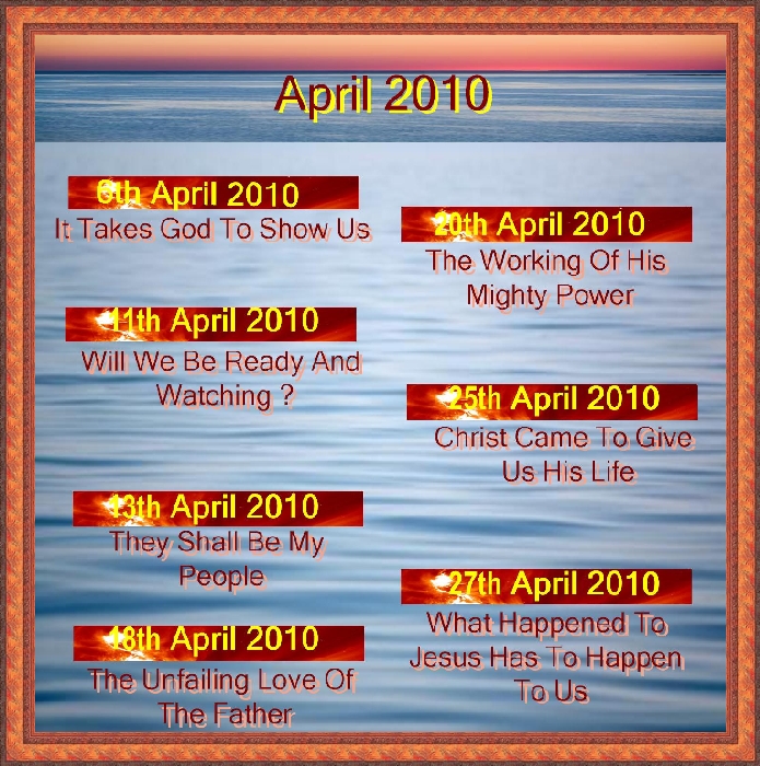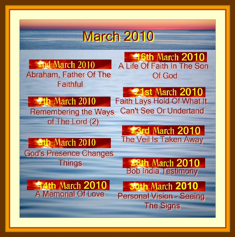 Abraham, Father Of The Faithful  2nd March 2010  Danny Remembering The Ways Of The Lord (2)  7th March 2010  Pastor Kim L.Page God's Presence Changes Things  9th March 2010  Pastor Kim L.Page A Memorial Of Love  14th March 2010  Pastor Kim L.Page A Life Of Faith In The Son Of God  16th March 2010  Pastor Kim L.Page Faith Lays Hold Of What It Can't See Or Understand  21st March 2010  Pastor Kim L.Page The Vail Is Taken Away  23th March 2010  Pastor Kim L.Page Bob India Testimony  28th March 2010  Bob Personal Vision - Seeing The Signs  30th March 2010  Bob It Takes God To Show Us  6th April 2010  Bob Will We Be Ready And Watching ?  11th April 2010  Pastor Kim L.Page They Shall Be My People  13th April 2010  Bob The Unfailing Love Of The Father  18th April 2010   Bob The Working Of His Mighty Power  20th April 2010   Bob Christ Came To Give Us His Life   25th April 2010  Pastor Kim L.Page What Happened To Jesus Has To Happen To Us  27th April 2010   Bob