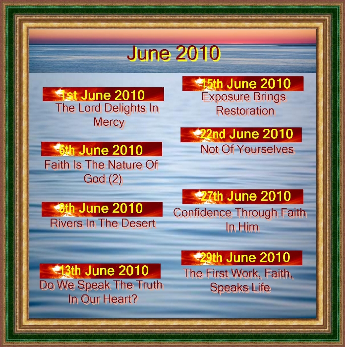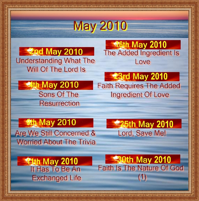 Understanding What The Will Of The Lord Is  2nd May 2010  Pastor Kim L.Page Sons Of The Resurrection  4th May 2010  Bob Are We Still Concerned & Worried About The Trivia  9th May 2010  Pastor Kim L.Page It Has To Be An Exchanged Life  11th May 2010  Bob The Added Ingredient Is Love  16th May 2010  Pastor Kim L.Page Faith Requiires The Added Ingredient Of Love  23rd May 2010  Pastor Kim L.Page Lord, Save Me!  25th May 2010  Bob Faith Is The Nature Of God (1)  30th May 2010  Pastor Kim L.Page The Lord Delights In Mercy  1st June 2010  Bob Faith Is The Nature Of God (2)  6th June 2010  Pastor Kim L.Page Rivers In The Desert  8th June 2010  Bob Do We Speak The Truth In Our Heart?  13th June 2010  Pastor Kim L.Page Exposure Brings Restoration  15th June 2010  Bob Are We Taking Seriously Those Hindrances To Our Faith ?  20th June 2010  Pastor Kim L.Page Not Of Yourselves  22nd June 2010  Bob Confidence Through Faith In Him  27th June 2010  Pastor Kim L.Page The First Work, Faith, Speaks Life  29th June 2010  Bob
