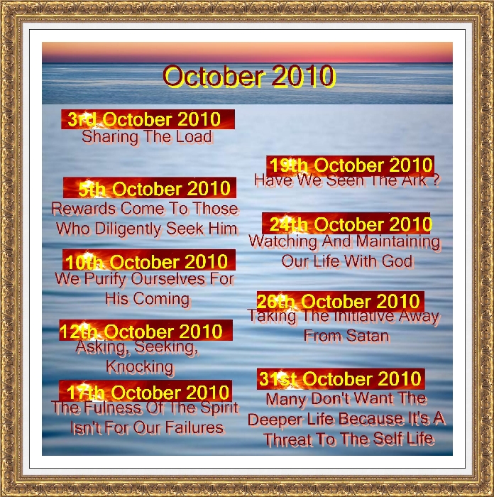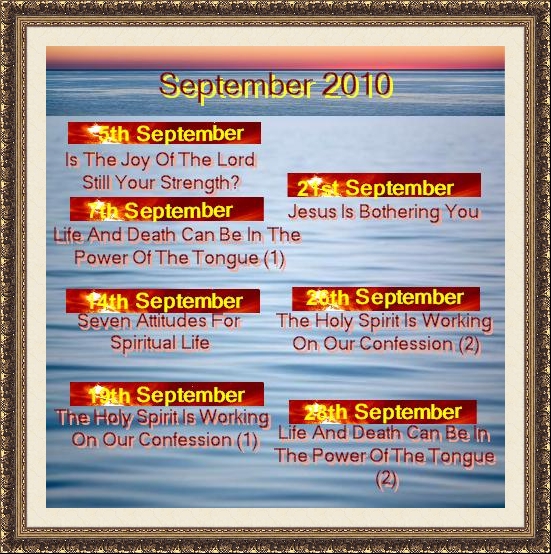 Is The Joy Of The Lord Still Your Strength?  5th September 2010  Pastor Kim L.Page Life And Death Can Be In The Power Of The Tongue  7th September 2010  Pastor Kim L.Page Seven Attitudes For Spiritual Life  14th September 2010  Danny The Holy Spirit Is Working On Our Confession  19th September 2010  Pastor Kim L.Page Jesus Is Bothering You  21st September 2010  Danny The Holy Spirit Is Working On Our Confession (2) 26th September 2010  Pastor Kim L.Page Life And Death Can Be In The Power Of The Tongue (2) 28th September 2010  Pastor Kim L.Page Sharing The Load 3rd October 2010  Pastor Kim L.Page Rewards Come To Those Who Diligently Seek Him 5th October 2010  Pastor Kim L.Page We Purify Ourselves For His Coming 10th October 2010  Pastor Kim L.Page Asking, Seeking, Knocking 12th October 2010  Pastor Kim L.Page The Fulness Of The Spirit Isn't For Our Failures 17th October 2010  Pastor Kim L.Page Have We Seen The Ark ? 19th October 2010  Pastor Kim L.Page Watching And Maintaining Our Life With God 24th October 2010  Pastor Kim L.Page Taking The Initiative Away From Satan 26th October 2010  Pastor Kim L.Page Many Don't Want The Deeper Life Because It's A Threat To The Self Life 31st October 2010  Pastor Kim L.Page