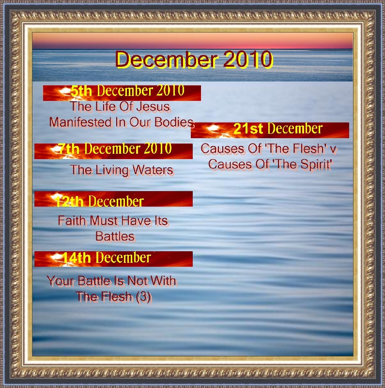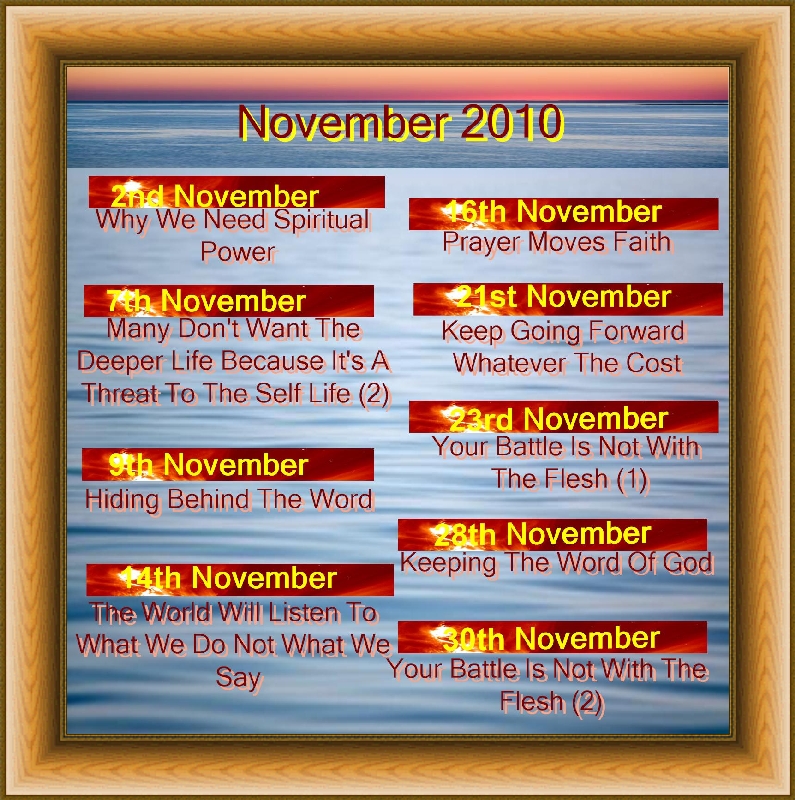 Why We Need Spiritual Power 2nd November 2010  Danny Many Don't Want The Deeper Life Because It's A Threat To The Self Life (2) 7th November 2010  Pastor Kim L. Page Hiding Behind The Word 9th November 2010  Pastor Kim L. Page The World Will Listen To What We Do Not What We Say 14th November 2010  Pastor Kim L. Page Prayer Moves Faith 16th November 2010  Pastor Kim L. Page Keep Going Forward Whatever The Cost 21st November 2010  Pastor Kim L. Page Your Battle Is Not With The Flesh (1) 23rd November 2010  Pastor Kim L. Page Keeping The Word Of God 28th November 2010  Pastor Kim L. Page Your Battle Is Not With The Flesh (2)30th November 2010  Pastor Kim L. Page The Life Of Jesus Manifested In Our Bodies 5th December 2010  Pastor Kim L. Page The Living Waters 7th December 2010  Danny Faith Must Have Its Battles 12th December 2010  Pastor Kim L. Page Your Battle Is Not With The Flesh (3) 14th December 2010  Pastor Kim L. Page Causes Of 'The Flesh' v Causes Of 'The Spirit' 21st December 2010  Pastor Kim L. Page