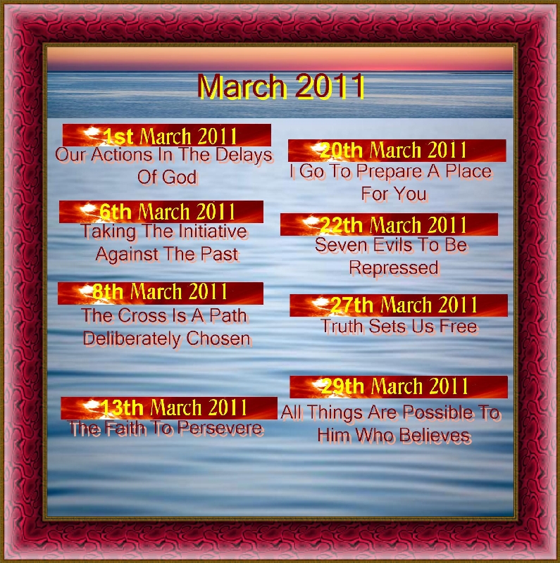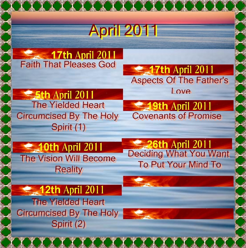 Our Actions In The Delays Of God 1st March 2011  Pastor Kim L. Page Taking The Initiative Against The Past 6th March 2011  Pastor Kim L. Page The Cross Is A Path Deliberately Chosen 8th March 2011  Pastor Kim L. Page The Faith To Persevere 13th March 2011  Pastor Kim L. Page I Go To Prepare A Place For You 20th March 2011  Pastor Kim L. Page Seven Evils To Be Repressed 22nd March 2011  Danny Truth Sets Us Free 27th March 2011  Pastor Kim L. Page All Things Are Possible To Him Who Believes 29th March 2011  Pastor Kim L. Page Faith That Pleases God 3rd April 2011  Pastor Kim L. Page The Yielded Heart Circumcised By The Holy Spirit (1) 5th April 2011  Bob The Vision Will Become Reality 10th April 2011  Pastor Kim L. Page The Yielded Heart Circumcised By The Holy Spirit (2) 12th April 2011  Bob Aspects Of The Father's Love  17th April 2011  Bob Covenants of Promise  19th April 2011  Bob Deciding What You Want To Put Your Mind To 26th April 2011  Pastor Kim L. Page