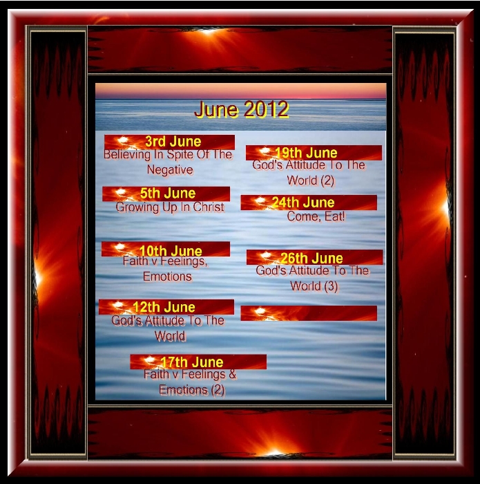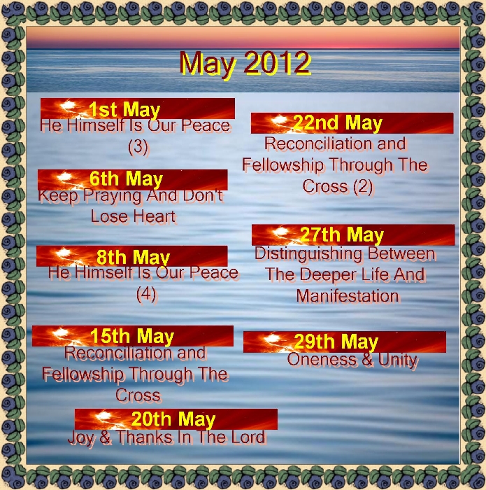 He Himself Is Our Peace (3)  1st May 2012  Bob Keep Praying And Don't Lose Heart  6th May 2012  Pastor Kim He Himself Is Our Peace (4)  8th May 2012  Bob Reconciliation and Fellowship Through The Cross  15th May 2012  Bob Joy & Thanks In The Lord  20th May 2012  Pastor Kim L. Page Reconciliation and Fellowship Through The Cross (2)  22nd May 2012  Bob Distinguishing Between The Deeper Life And Manifestation  27th May 2012  Pastor Kim L. Page Oneness & Unity  29th May 2012  Bob Believing In Spite Of The Negative  3rd June 2012  Pastor Kim L. Page Growing Up In Christ  5th June 2012  Bob Faith v Feelings, Emotions  10th June 2012  Pastor Kim L. Page God's Attitude To The World  12th June 2012  Bob Faith v Feelings & Emotions (2)  17th June 2012  Pastor Kim L. Page God's Attitude To The World (2)  19th June 2012  Bob Come, Eat!  24th June 2012  Pastor Kim L. Page God's Attitude To The World (3)  26th June 2012  Bob