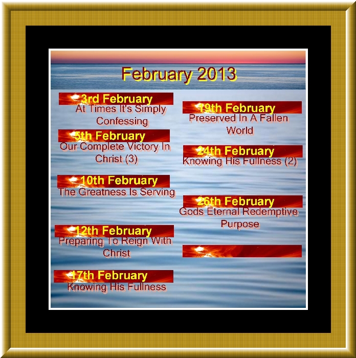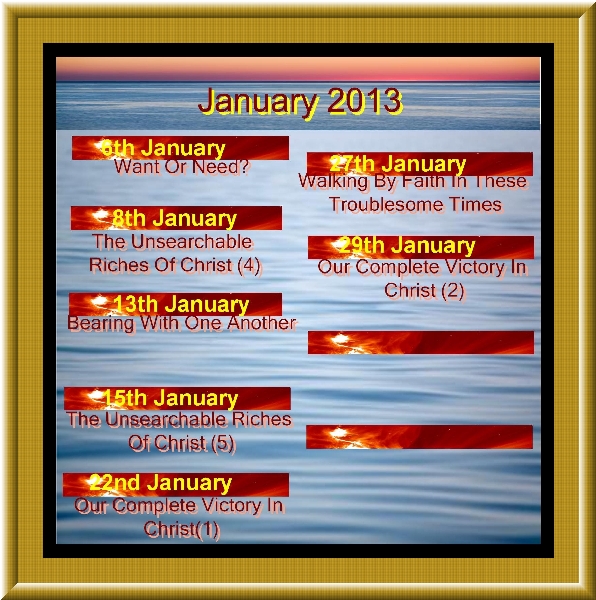 Want Or Need??  6th January 2013  Pastor Kim L.Page The Unsearchable Riches Of Christ (4)  8th January 2013  Bob Bearing With One Another  13th January 2013  Pastor Kim L.Page The Unsearchable Riches Of Christ (5)  15th January 2013  Bob Our Complete Victory In Christ(1)  22nd January 2013  Bob Walking By Faith In These Troublesome Times  27th January 2013  Pastor Kim L.Page Our Complete Victory In Christ(2)  29th January 2013  Bob At Times It's Simply Confessing  3rd February 2013  Pastor Kim L.Page Our Complete Victory In Christ(3)  5th February 2013  Bob The Greatness Is Serving  10th February 2013  Pastor Kim L.Page Preparing To Reign With Christ  12th February 2013  Pastor Danny Knowing His Fullness  17th February 2013  Pastor Kim L.Page Preserved In A Fallen World  19th February 2013  Pastor Kim L.Page Knowing His Fullness (2)  24th February 2013  Pastor Kim L.Page Gods Eternal Redemptive Purpose  26th February 2013  Bob