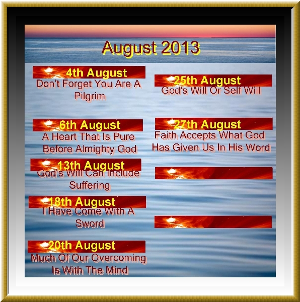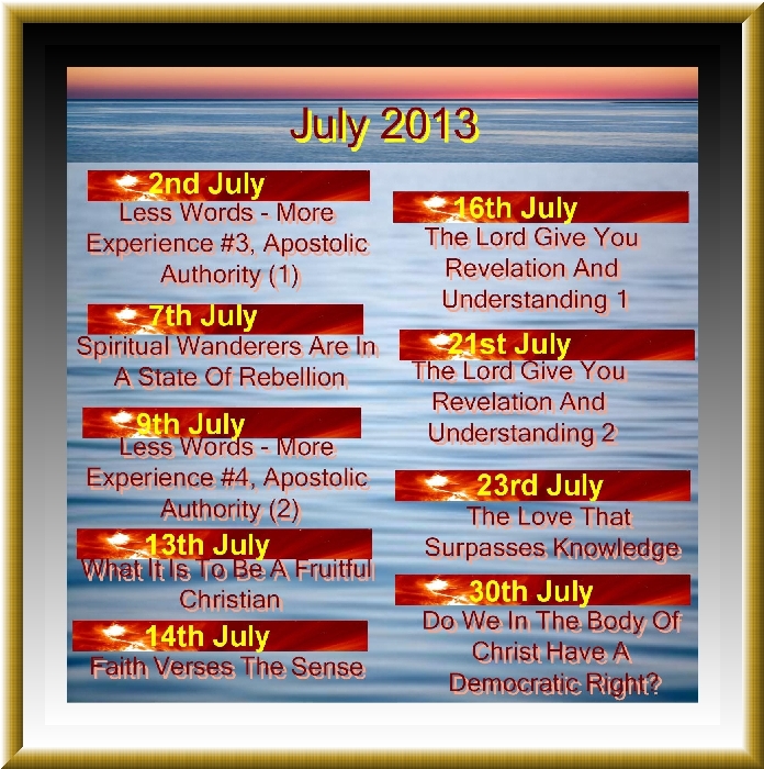 Less Words - More Experience (3)  2nd July 2013  Bro Bob Spiritual Wanderers Are In A State Of Rebellion  7th July 2013  Pastor Kim Less Words - More Experience (4)  10th July 2013  Bro Bob What It Is To Be A Fruitful Christian  13th July 2013  Bro Bob Faith Verses The Sense Realm  14th July 2013  Pastor Kim The Lord Give You Revelation And Understanding 1  16th July 2013  Pastor Kim The Lord Give You Revelation And Understanding 2  21st July 2013  Pastor Kim The Love That Surpasses Knowledge  23rd July 2013  DANNY Do We In The Body Of Christ Have A Democratic Right?  30th July 2013  Pastor Kim Don't Forget You Are A Pilgrim  4th August 2013  Pastor Kim A Heart That Is Pure Before Almighty God  6th August 2013  Pastor Kim God's Will Can Include Suffering  13th August 2013  Pastor Kim I Have Come With A Sword  18th August 2013  Pastor Kim Much Of Our Overcoming Is With The Mind  20th August 2013  Pastor Kim God's Will Or Self Will  25th August 2013  Pastor Kim Faith Accepts What God Has Given Us In His Word  27th August 2013  Pastor Kim
