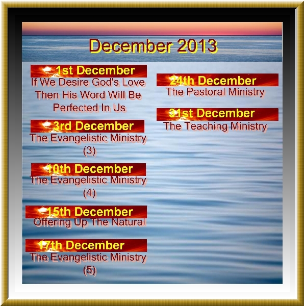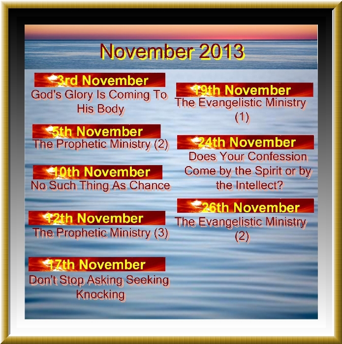 God's Glory Is Coming To His Body  3rd November 2013  Pastor Kim The Prophetic Ministry (2)  5th November 2013  Bro Bob No Such Thing As Chance  10th November 2013  Pastor Kim The Prophetic Ministry (3)  12th November 2013  Bro Bob Don't Stop Asking Seeking Knocking  17th November 2013  Pastor Kim The Evangelistic Ministry (1)  19th November 2013  Bro Bob Does Your Confession Come by the Spirit or by the Intellect?  24th November 2013  Pastor Kim The Evangelistic Ministry (2)  26th November 2013  Bro Bob If We Desire God's Love Then His Word Will Be Perfected In Us  1st December 2013  Pastor Kim The Evangelistic Ministry (3)  3rd December 2013  Bro Bob The Evangelistic Ministry (4)  10th December 2013  Bro Bob Offering Up The Natural  15th December 2013  Pastor Kim The Evangelistic Ministry (5)  17th December 2013  Bro Bob The Pastoral Ministry  24th December 2013  Bro Bob The Teaching Ministry  31st December 2013  Bro Bob