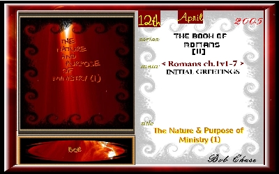 The Nature & Purpose of Ministry (1)  12th April 2005  Bob The Nature & Purpose of Ministry (2)  19th April 2005  Bob
